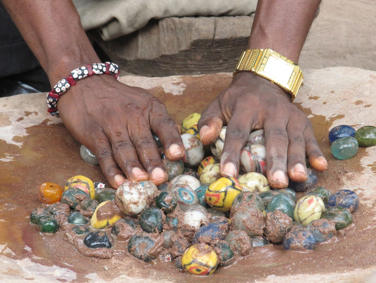 When finished and cooled, the bore rods are removed. The glass beads are polished by hand against a concave stone using sand and water.